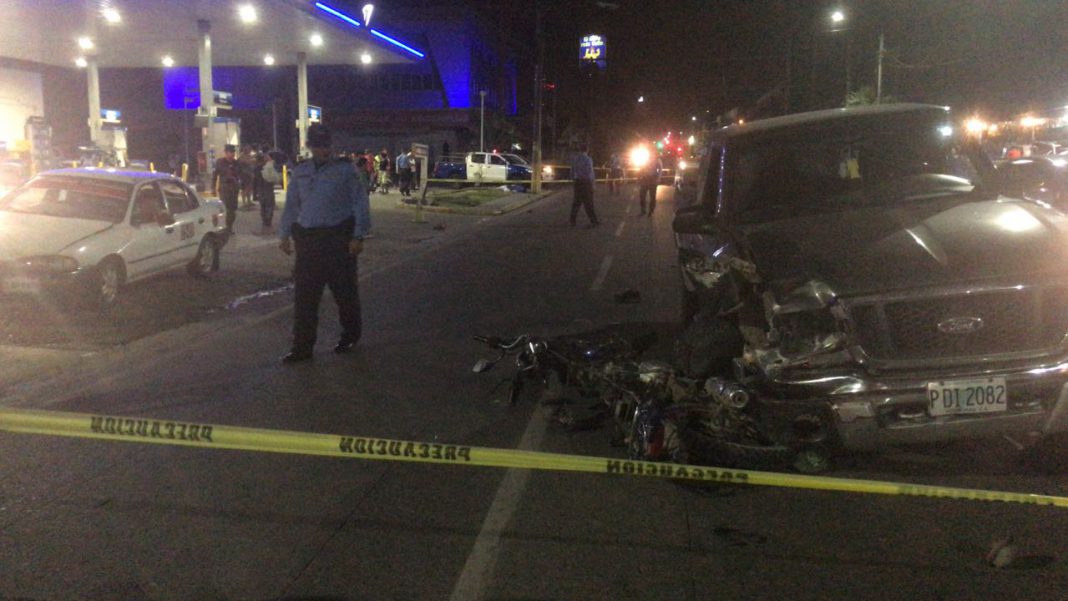 El pick up PDI 2082 arrastró por casi una cuadra una motocicleta con la que colisionó la noche del lunes en la primera calle del barrio Santa Anita de San Pedro Sula dejando al conductor muerto unos metros mas adelante.