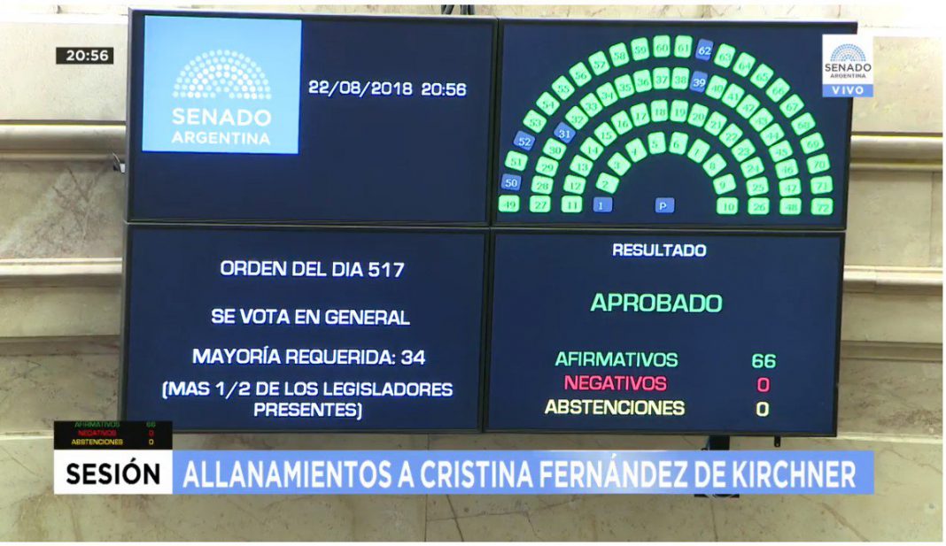 El Senado de Argentina aprobó por unanimidad (66 votos a favor, 0 en contra) los allanamientos a las propiedades de la senadora y expresidenta Cristina Fernández de Kirchner, esto tras una solicitud del juez Claudio Bonadio, quien la investiga.