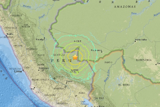 El movimiento se registró a las 4:04 del viernes a una profundidad de 609 kilómetros (378 millas). El epicentro estaba a 135 kilómetros (83 millas) al oeste de Iñapari en Perú, y a 226 kilómetros (140 millas) al oeste de Cobija en Bolivia.
