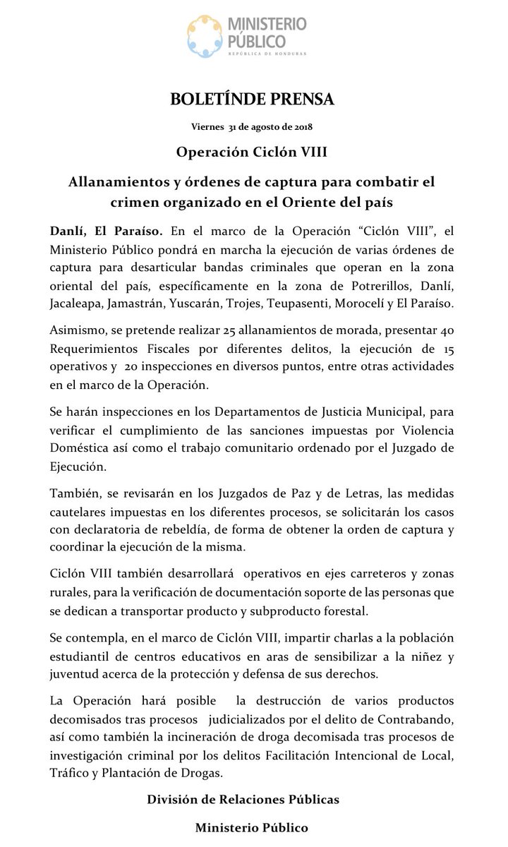 Danlí, El Paraíso. En el marco de la Operación “Ciclón VIII”, el Ministerio Público pondrá en marcha la ejecución de varias órdenes de captura para desarticular bandas criminales que operan en la zona oriental del país, específicamente en la zona de Potrerillos, Danlí, Jacaleapa, Jamastrán, Yuscarán, Trojes, Teupasenti, Morocelí y El Paraíso.