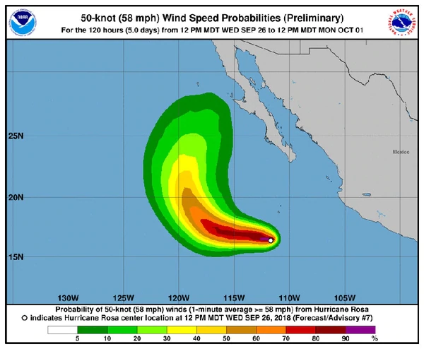 A las 15.00 GMT, Rosa se localizaba a 820 km al oeste-suroeste del turístico puerto de Manzanillo, en el estado de Colima (noreste), con vientos de 120 km/h y rachas de hasta 150 km/h, indica el último informe del SMN.