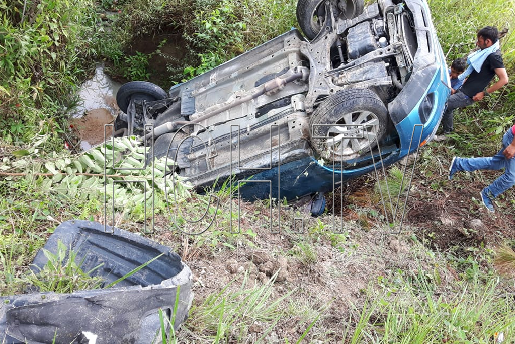 APARENTEMENTE EL VEHICULO MISUBISHI Lanser Evolution PERDIO EL CONTROL POR LO LISO QUE SE ENCUENTRA LA CARRETERA Y CAERON A UNA HONDONADA NO TAN PROFUNDA.