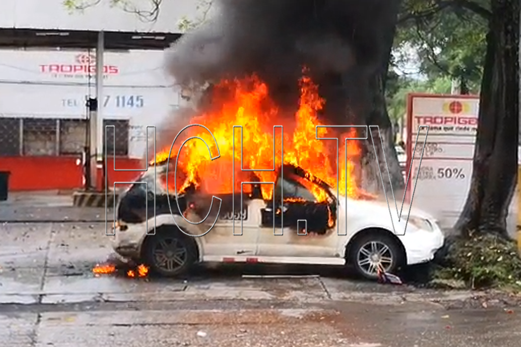 #ÚltimoMomento Así fue consumido por las llamas el #Taxi en #SPS en el que resultaron heridas tres personas entre ellas un menor de edad #HCHFindeSemana pic.twitter.com/sXBTpqoe8W