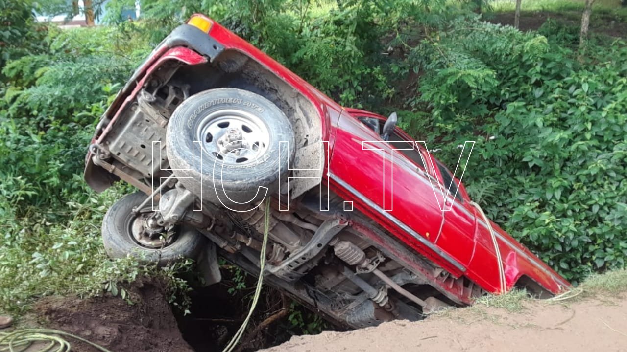 Un vehículo rojo tipo pick up se fue a una hondonada en Juticalpa,Olancho.