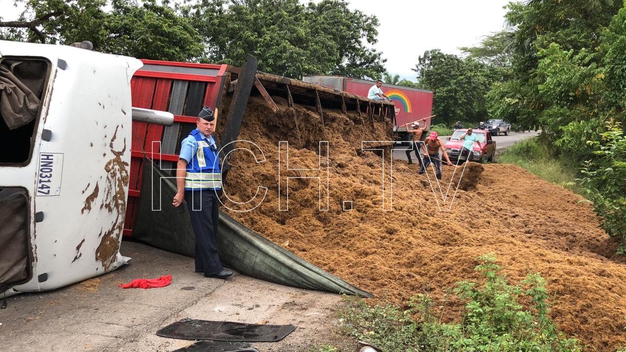En la comunidad de Quebrada de Arena en la carretera entre Tocoa y Trujillo en el departamento de Colon el pesado automotor con registro HN03147 se volteó a un lado de la calzada, afortunadamente el incidente solo deja pérdidas materiales.