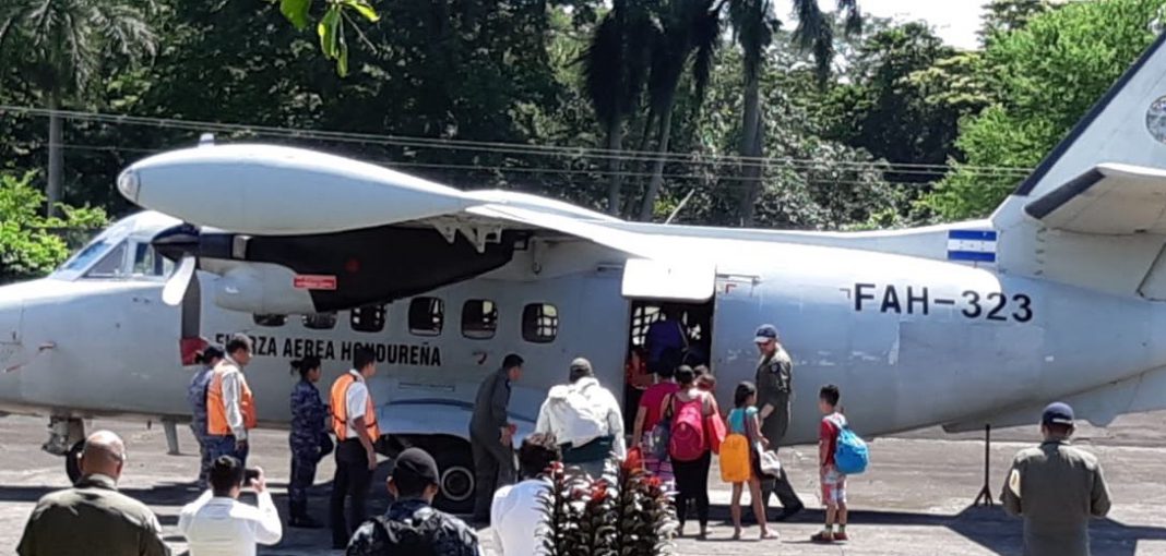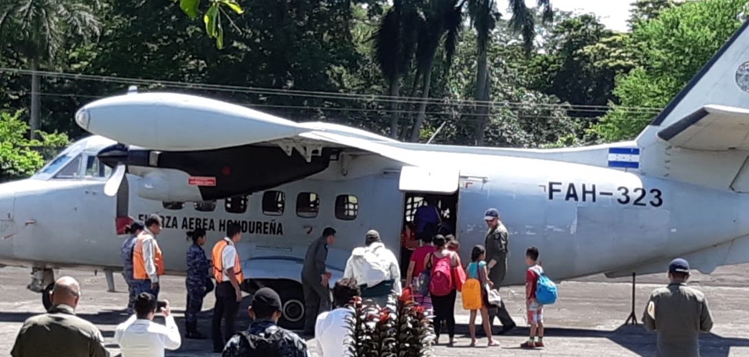 Adultos mayores, mujeres y menores de edad abordaron la aeronave en Guatemala, puesta a disposición por la FAH para brindar un viaje mas seguro y rápido.