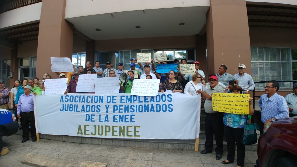 Miembros de la asociación de jubilados y pensionados de la Empresa Nacional de Energía Eléctrica, ENEE, se apostaron este miércoles ante las instalaciones del Ministerio Público preocupado por el futuro del fondo de prestaciones sociales.