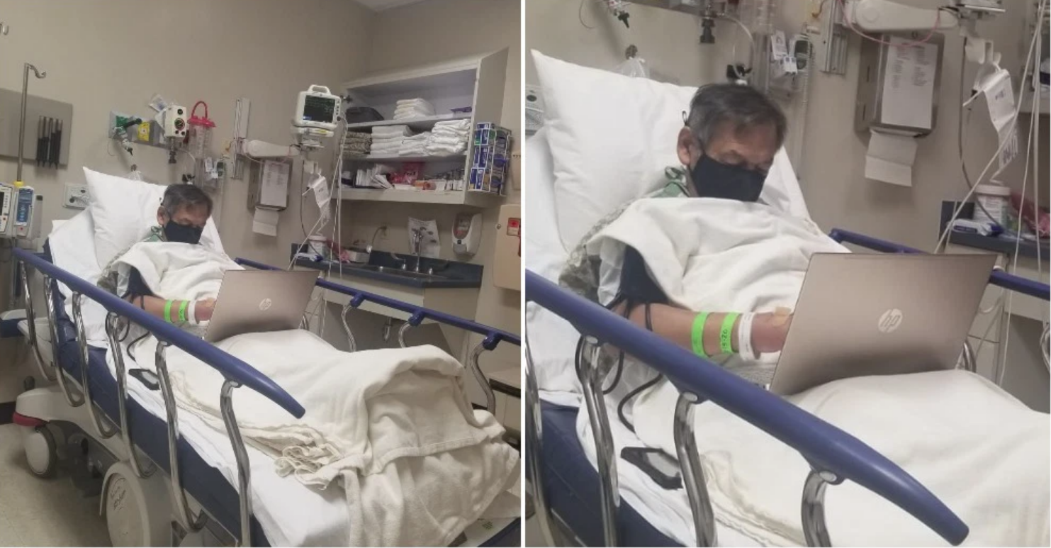 La imagen fue compartida en Facebook un 18 de diciembre con un fuerte testimonio, donde relata que, su padre sabiendo que sería internado, lo primero que empacó fue su computadora y su cargador, para terminar los informes en la camilla del hospital.