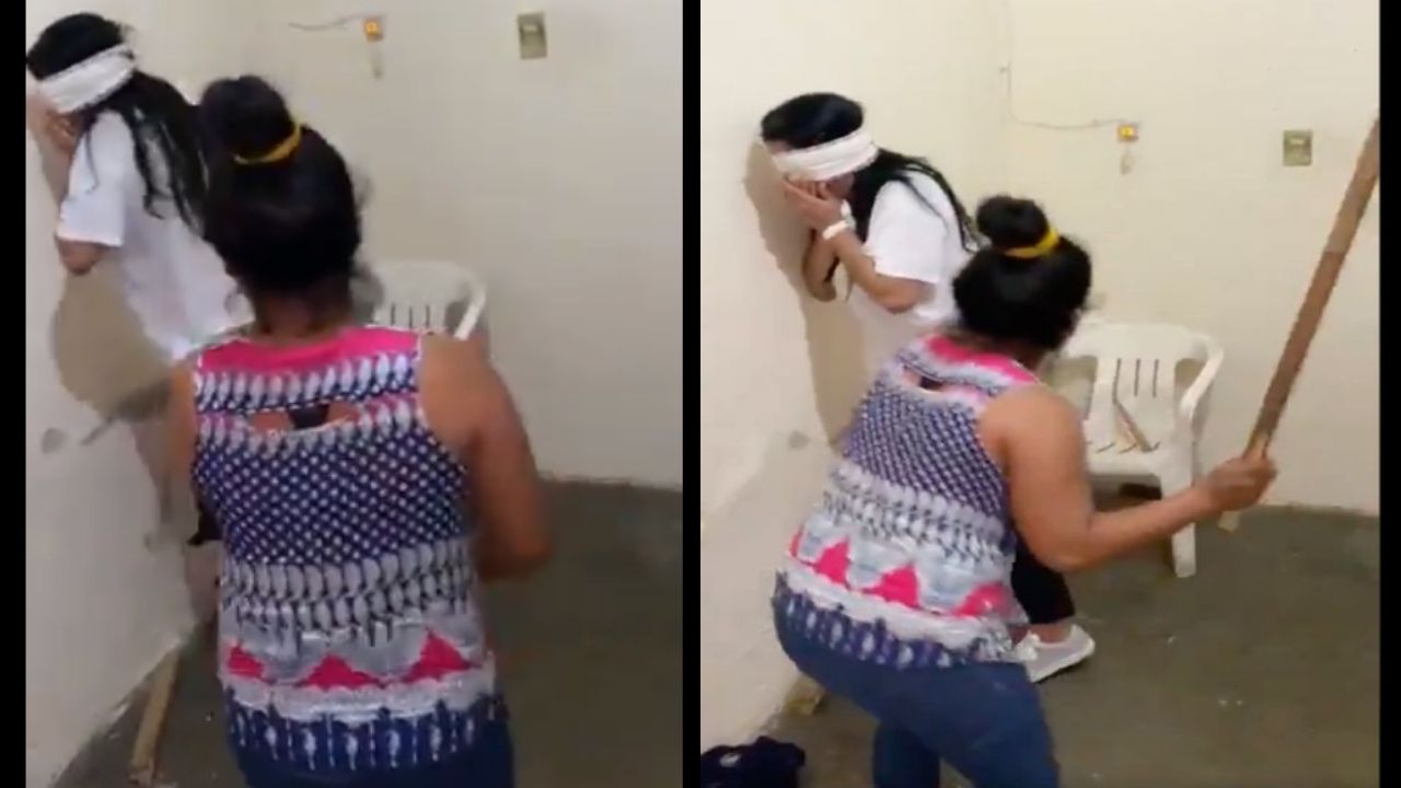 En las imágenes se aprecia a la víctima con el rostro cubierto, amarrada de las manos y con el pantalón abajo con su trasero descubierto, mientras una mujer la golpea con una tabla que incluso se rompe debido a los múltiples golpes.