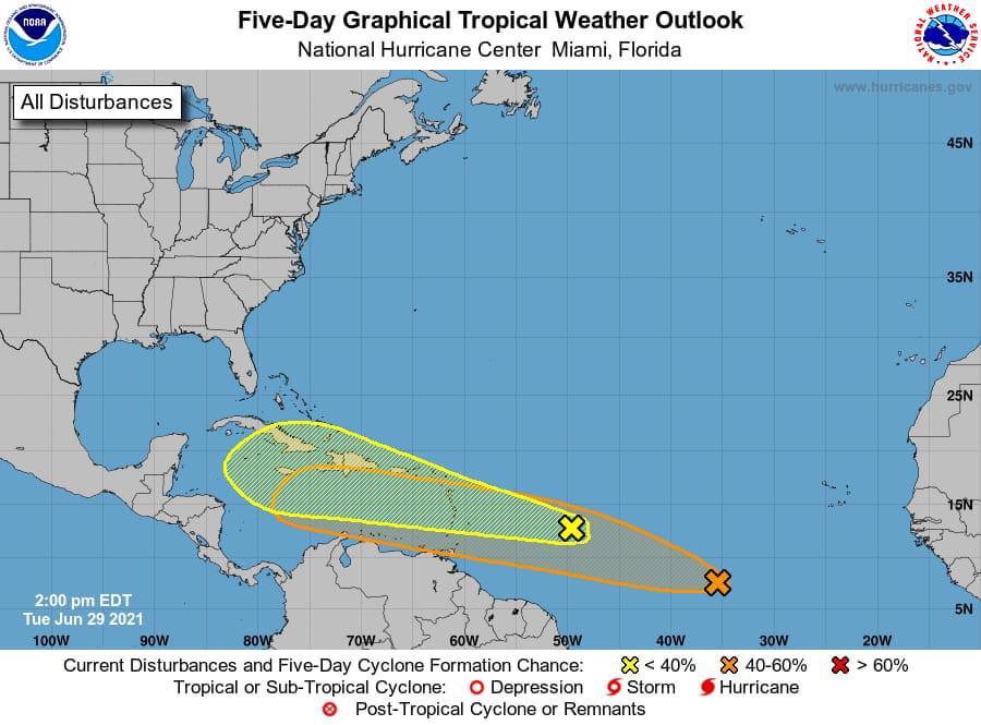 “Algún desarrollo lento de este disturbio es posible a finales de esta semana y este fin de semana, mientras el sistema se mueve hacia el oeste-noroeste de 15 a 20 mph, probablemente llegando a las Antillas Menores el miércoles por la noche”, informa el boletín de las 8:00 a.m. del CNH.
