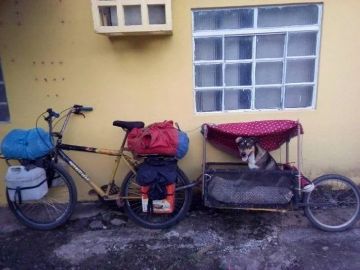 Pero el perrito no podía quedarse solo en la casa esperando a que su dueño volviera, por eso Alejandro trabajó durante un par de semanas adaptando su bicicleta. Utilizó un cesto de la basura y le puso un pequeño toldo para proteger al perro del sol, la lluvia o cualquier inclemencia del clima. Luego lo sujetó sobre una pequeña canastilla que después puso en la parte trasera de su bicicleta. De esta manera, ambos iniciaron su primer viaje juntos por Sudamérica.