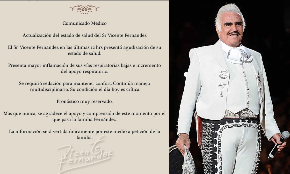 Esta mañana, la familia del cantante Vicente Fenández publicó el último reporte de salud del “Charro de Huentitán”, en donde se reporta que su estado de salud se ha “agudizado”.