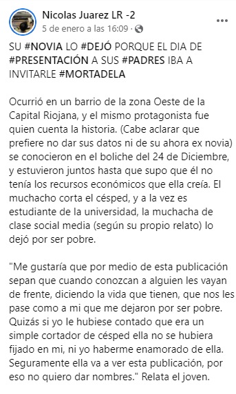 El joven -bajo el anonimato- le comentó su historia al periodista Pedro Nicolás Juárez, quien se encargó de difundirla en Facebook, convirtiéndose más tarde en viral.