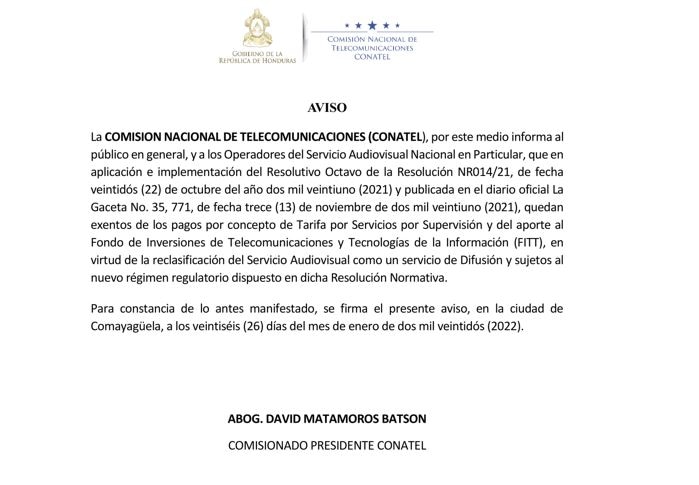 CONATEL avisa que quedan exentos los pagos por concepto de tarifa por Servicio audiovisual de Supervisión y del Aporte al FITT