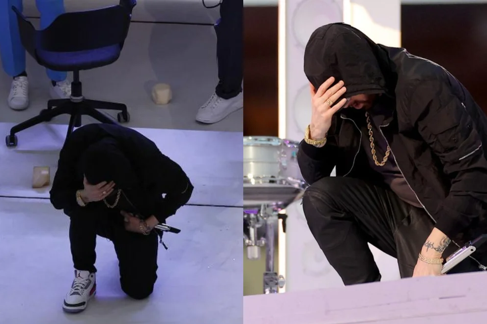 El rapero aprovechó su participación en el Pepsi Super Bowl LVI Halftime Show para hacer un gesto que resultaría desafiante para la NFL. Después de cantar su éxito del 2002 “Lose Yourself”, el artista decidió hincarse.