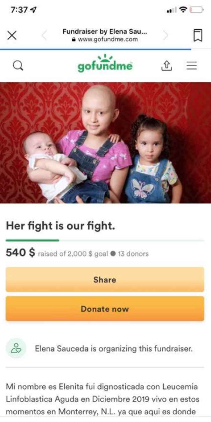 Así mismo, Fernanda también compartió la página de donaciones para Elena, otra niña que también espera ayuda de la gente pero que ha ido muy lento.