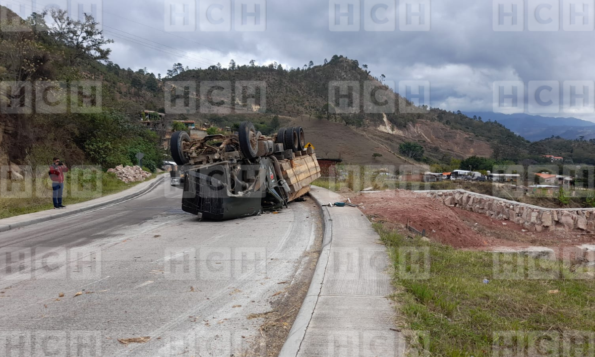 El conductor de una pesada rastra resultó con heridas luego de volcarse en la aldea El Lolo.
