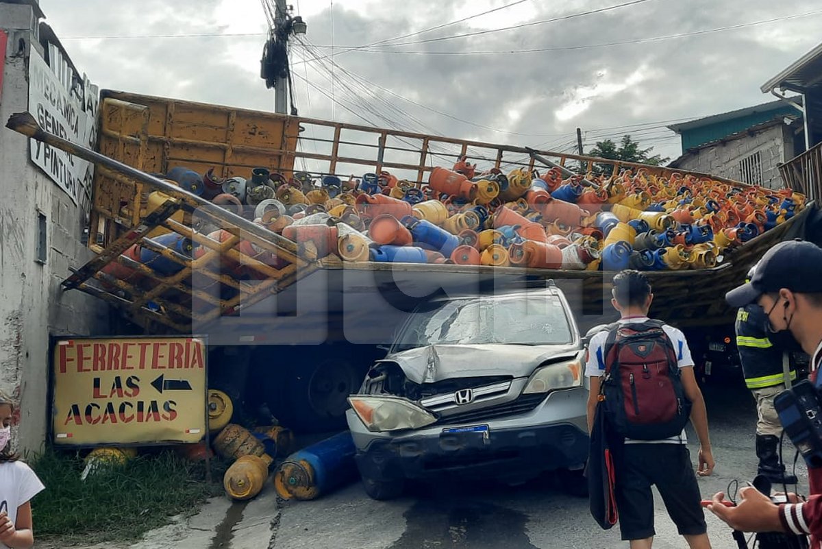 Una rastra que transportaba varios chimbos de gas se accidentó cayendo encima de una camioneta en la capital.