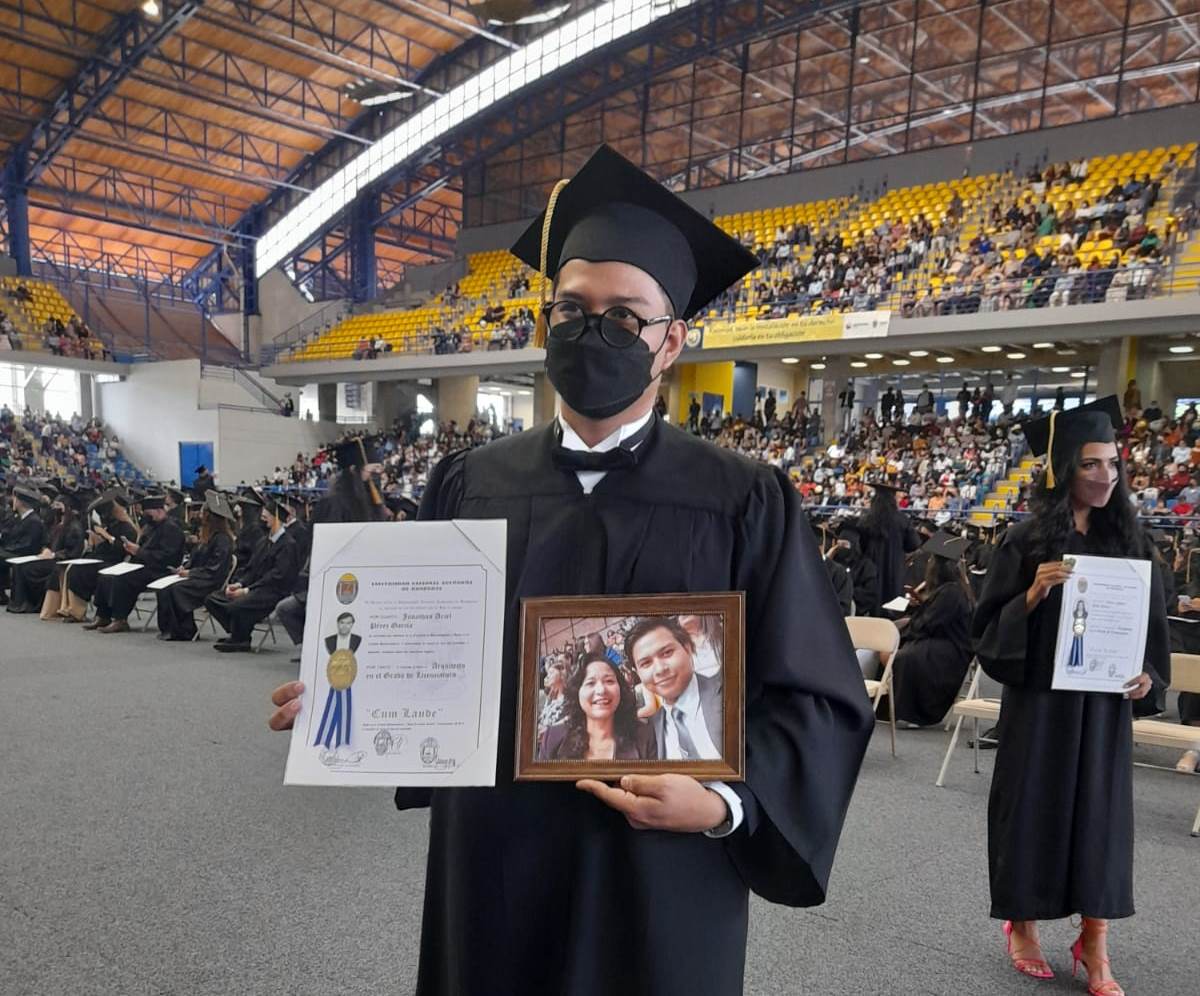 Jonathan Pérez recibió su título universitario de Arquitecto con mención honorífica Cum Laude, portando un retrato de su madre, quien falleció mientras él cursaba su carrera.