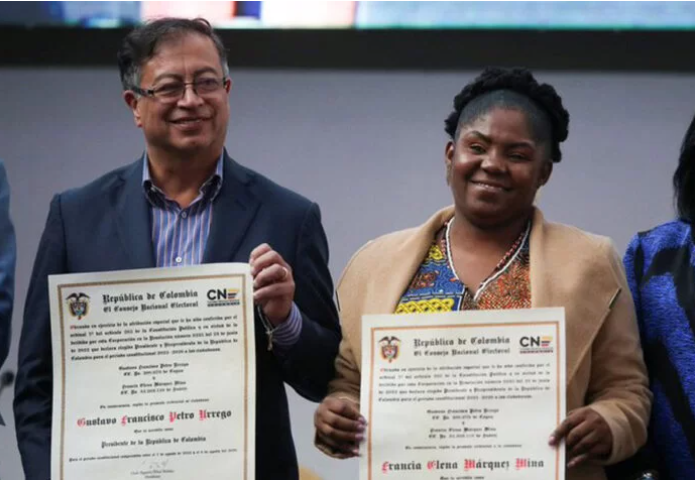 Bailando unos segundos al ritmo de sonidos del Pacífico, Francia Márquez recibió primero la credencial como vicepresidenta de Colombia de manos de la magistrada Doris Ruth Méndez Cubillos, única mujer del CNE, quien consideró un «honor inmenso» entregar el documento «a la primera mujer afrodescendiente en ocupar el cargo».