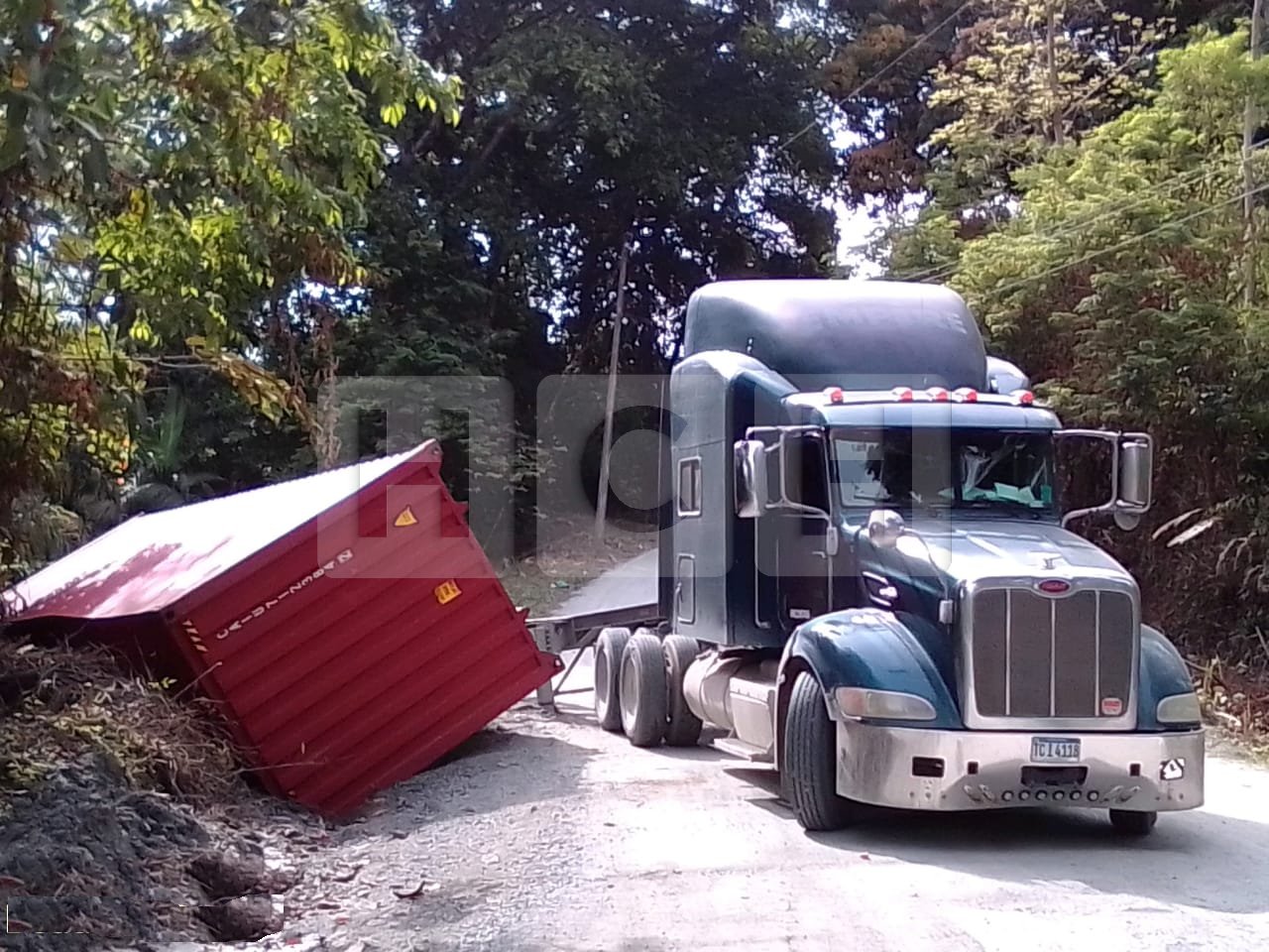 Contenedor de rastra termina encunetado tras desacoplar en Puerto Cortés