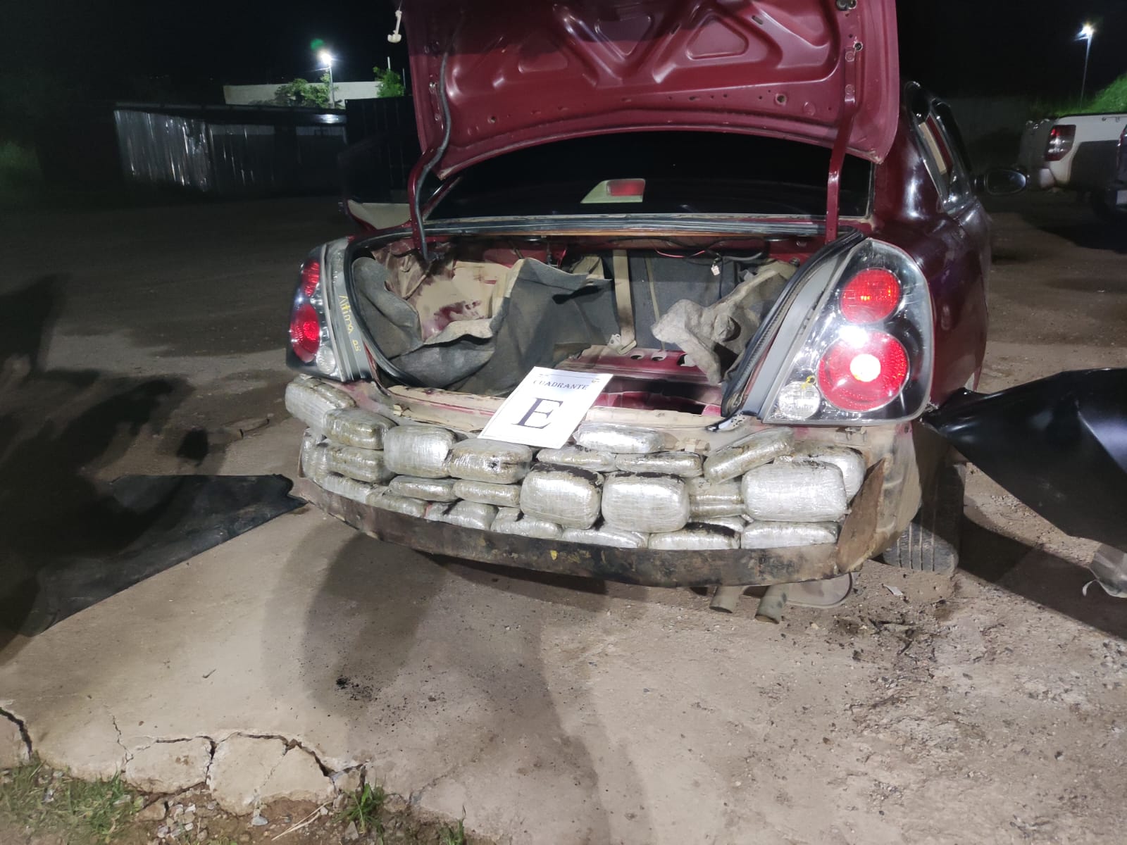 Agentes del Centro Antipandillas Transnacional (CAT) y técnicos en procesamiento de la escena del crimen de la ATIC, en la inspección encontraron un fondo falso entre el bomper y la compuerta de la cajuela trasera del vehículo, donde llevaban apilados 42 paquetes dobles y 14 individuales de la hierba, siendo un total de 98 alijos forrados con plástico.