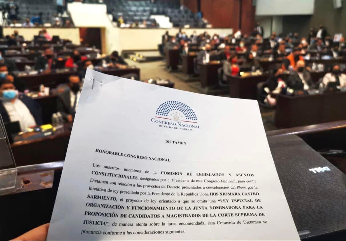 En primer debate el Congreso Nacional aprobó este jueves el dictamen sobre la Ley Especial de Organización y Funcionamiento de la Junta Nominadora para la proposición de Candidatos a Magistrados de la Corte Suprema de Justicia.