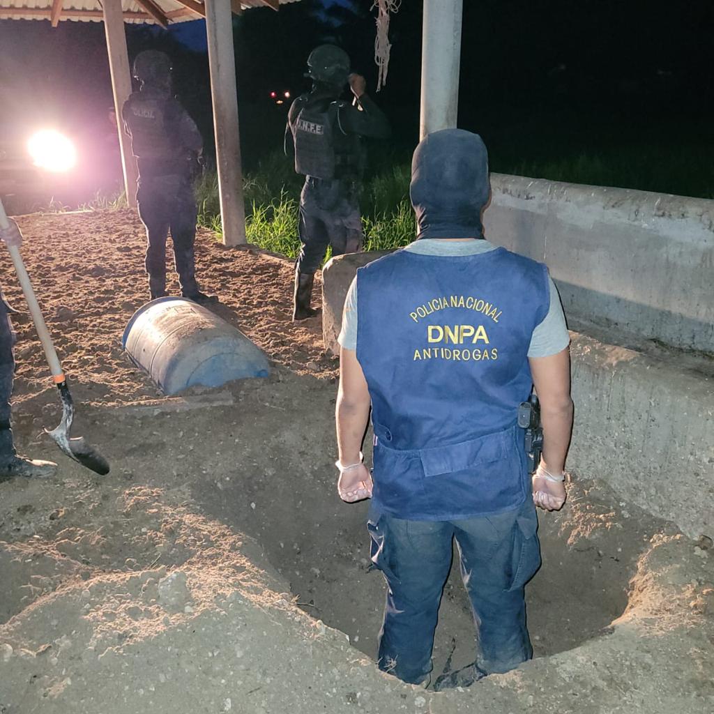 Agentes de la Dirección Nacional Policial Antidrogas, apoyados por personal de inteligencia policial, fuerzas especiales y policías de prevención comunitaria debieron cavar un metro para encontrar los 58 bloques de cocaína, los que se encontraban dentro de tres sacos de nailon, color rojo.