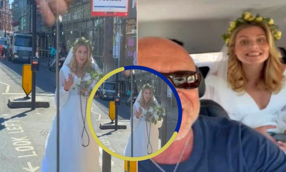 En un vídeo subido a la plataforma se ve a la mujer con su vestido blanco preocupada y al ver que un auto se detuvo en el semáforo de una calle de Londres, se acercó para pedirle al conductor que la llevara a la iglesia