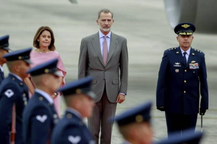 El Rey de España, que viaja acompañado por el ministro de Asuntos Exteriores, Unión Europea y Cooperación, José Manuel Albares, y por el Jefe de la Casa de SM el Rey, Jaime Alfonsín, fue recibido en la pista por la saliente vicepresidenta y canciller de Colombia, Marta Lucía Ramírez, con honores militares.