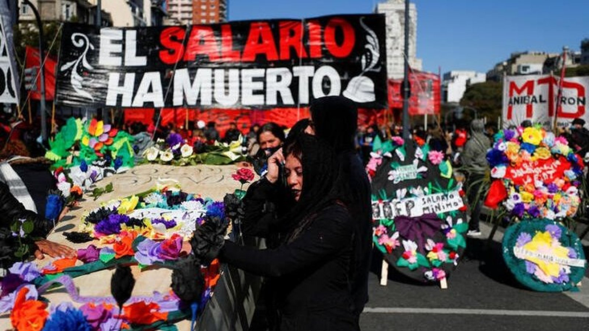 «El salario ha muerto» rezaba el cartel que acompañaba la procesión simbólica, con mujeres vestidas de luto y coronas con el mensaje «QEPD el salario mínimo», que recorrió las principales calles de la capital argentina y finalizó frente al Palacio Presidencial en la histórica Plaza de Mayo.