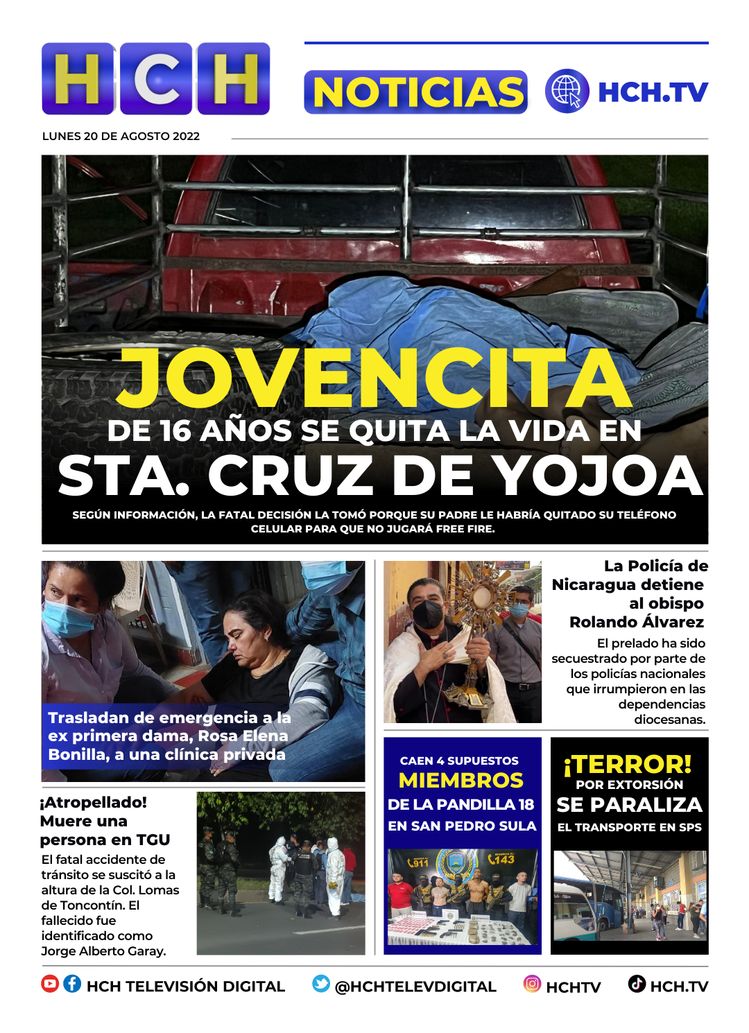 © 2025 - HCH Televisión Digital - Noticias de Honduras y el Mundo. Anillo Periférico, Complejo Empresarial Tegucigalpa, Honduras, C.A. Tel: (504) 2235-3245 / 2235-3246 / 2235-4875 / 2235-4876 LLÁMENOS GRATIS DESDE EE.UU: 3052801682 y 3052801735 © Copyright 2025 - HCH Televisión Digital. Todos nuestros contenidos están protegidos con derechos de autor.