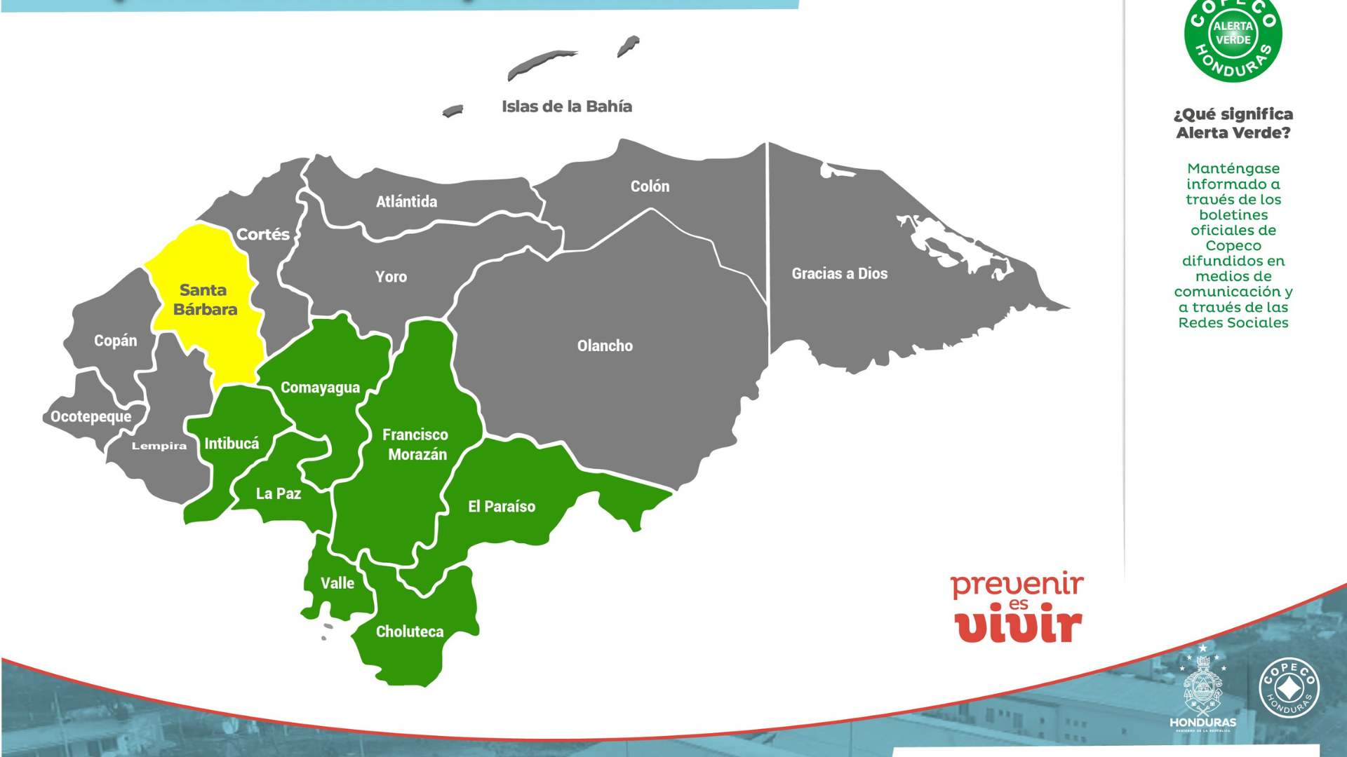 Asimismo, declara alerta verde para los departamentos de Comayagua, Francisco Morazán, La Paz, Intibucá, Valle, Choluteca y El Paraíso, debido a la formación de un eje de vaguada sobre la zona Central del país, que podría dejar acumulados de 60 a 80 milímetros (mm) mínimos y máximos de 120 mm.