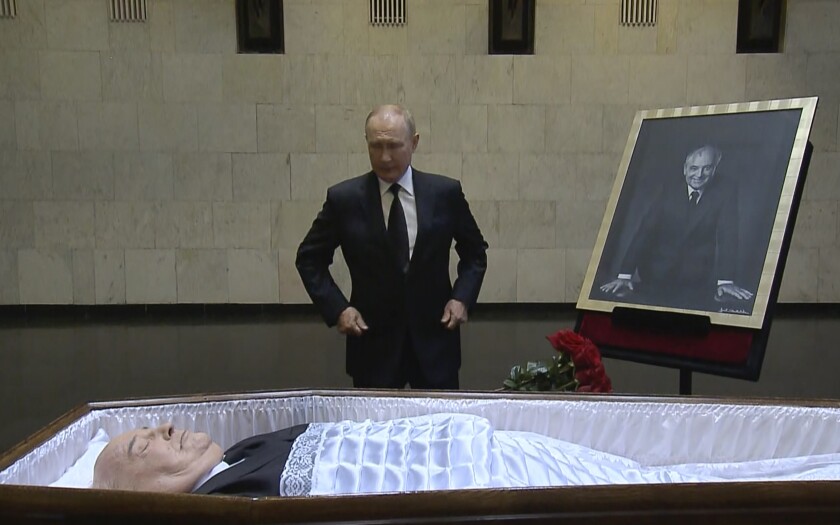 La televisión estatal rusa mostró a Putin colocando un ramo de rosas rojas cerca del ataúd abierto de Gorbachov en un gran salón vacío antes de hacer una pausa para un momento de silencio.