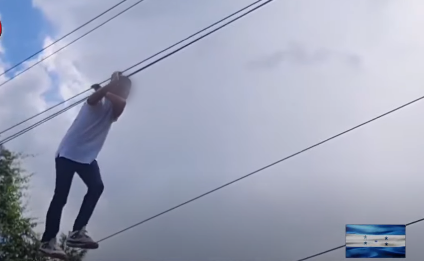 Tras la falta de un puente, las personas de la comunidad de Tablón Alto en Olancho, deben realizar acrobacias para llegar al otro lado.
