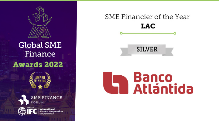 Tegucigalpa, 21de septiembre de 2022— Banco Atlántida fue nombrado ganador Plata en la categoría SME Financier of the Year LAC (Financiador Pyme del Año) en los Premios Global SME Finance Forum 2022 el 21de septiembre.