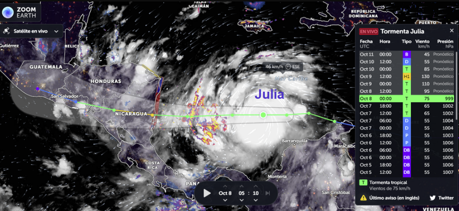 La tormenta tropical Julia se mueve por cálidas aguas al suroeste del Caribe hacia Centroamérica después de afectar a las costas de Venezuela y Colombia. Al alejarse de tierra, la tormenta ha ganado intensidad y organización. Una dorsal anticiclónica potente le cierra el paso hacia el norte obligándole a ir hacia el oeste.