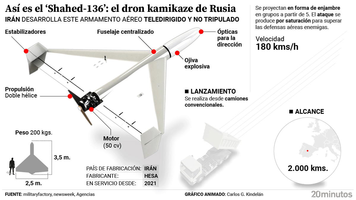 El dron Shahed 136 (también conocido por su denominación rusa como Geran-2) es un aparato aéreo teledirigido y no tripulado, desarrollado por la compañía iraní HESA. Basado en las municiones de merodeo ya utilizadas en otros países, entró en servicio en 2021, aunque Newsweek asegura que se estrenaron en 2020 durante la Guerra Civil de Yemen.