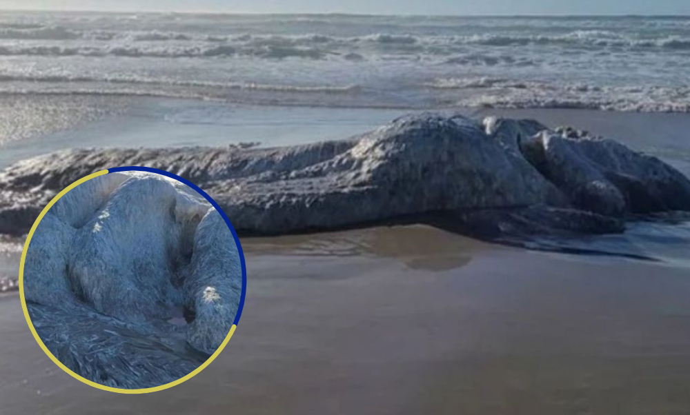La extraña criatura no tenía rostro ni ojos y al parecer fue arrastrada por un terremoto desde el fondo del mar hacia la arena. Fue Merica Lynn 28 años de edad y su novio, Adoni Tegner, quienes quedaron impactados cuando encontraron restos de algo parecido a una enorme animal repleto de cabello blanco.