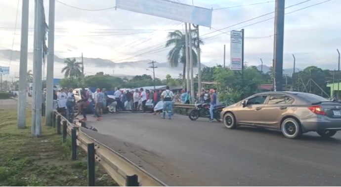 Empleados de Agroindustrias Integradas del Norte (AGROINSA) protestan sobre el puente del río Aguán en el departamento de Colón, quienes le exigen al gobierno central que desaloje a grupos campesinos que han invadido su lugar de trabajo.
