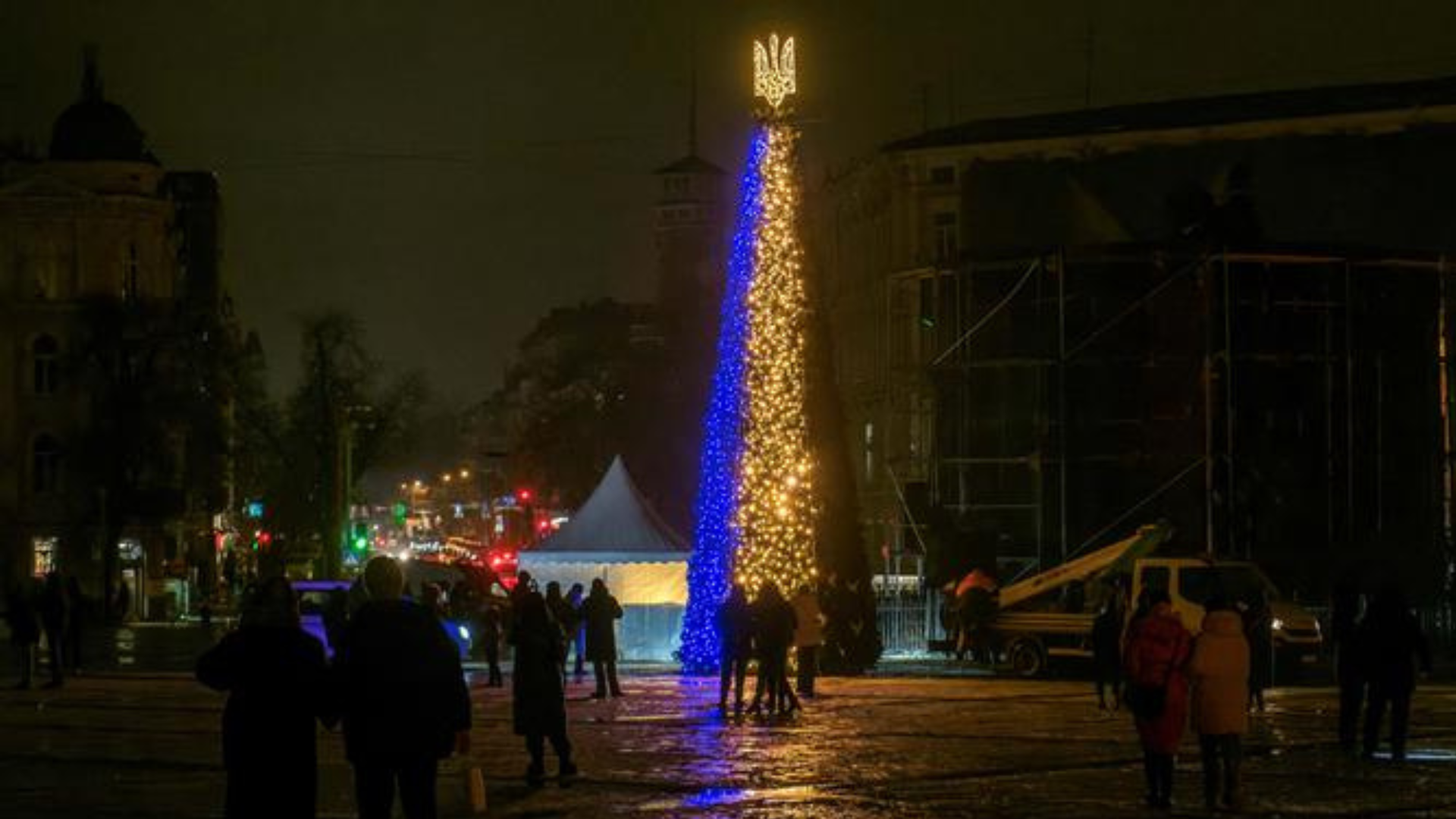 La jornada, que comenzó con un enjambre de ataques a infraestructuras críticas de la capital ucraniana, terminó con la inauguración del árbol artificial de 12 metros de altura decorado con palomas blancas de la paz.