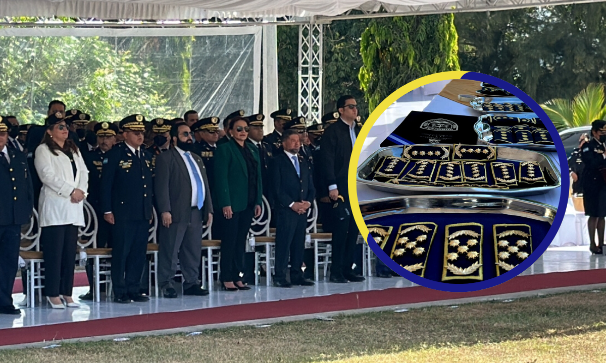 La presidenta de la República Xiomara Castro, en compañía del presidente del Congreso Nacional de Honduras, Luis Redondo y el secretario privado, Héctor Zelaya, llegan a la Academia Nacional de Policía ubicada en la ciudad de La Paz para participar en el ascenso de más de 300 oficiales de la Policía Nacional.