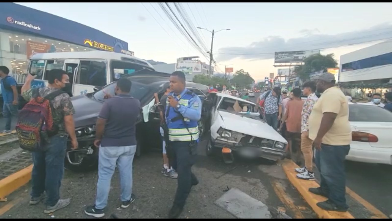 Varias personas resultaron gravemente heridas en un accidente de tránsito en la avenida Circunvalación de San Pedro Sula, el conductor de un bus rapidito no realizó el alto a tiempo e impactó contra cuatro vehículos turismos.