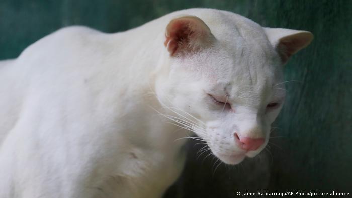 Una ocelote albina pasa sus días cazando presas ficticias y trepando pequeños troncos en un centro de conservación de Medellín, donde científicos interpretan el inédito hallazgo como síntoma de la deforestación del hábitat natural de este felino en Colombia.