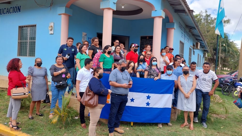Maestros del municipio de Catacamas, Olancho, protestan frente a la Dirección Departamental de este municipio exigiendo un incremento salarial acorde al precio de la canasta básica actual.