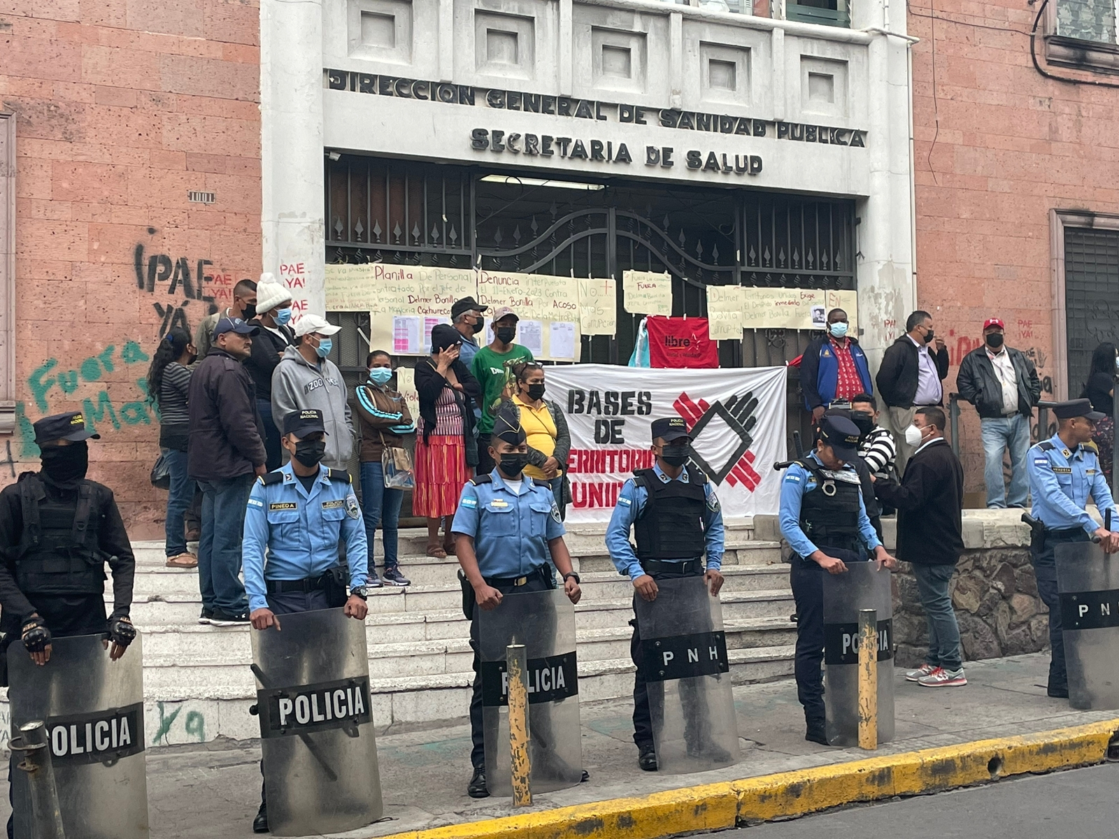 Colectivos del partido Libertad y Refundación (Libre) protestan en las afueras de la Secretaría de Salud (Sesal) en Tegucigalpa exigiendo la destitución del gerente de Recursos Humanos de esta secretaría, Delmer Bonilla.