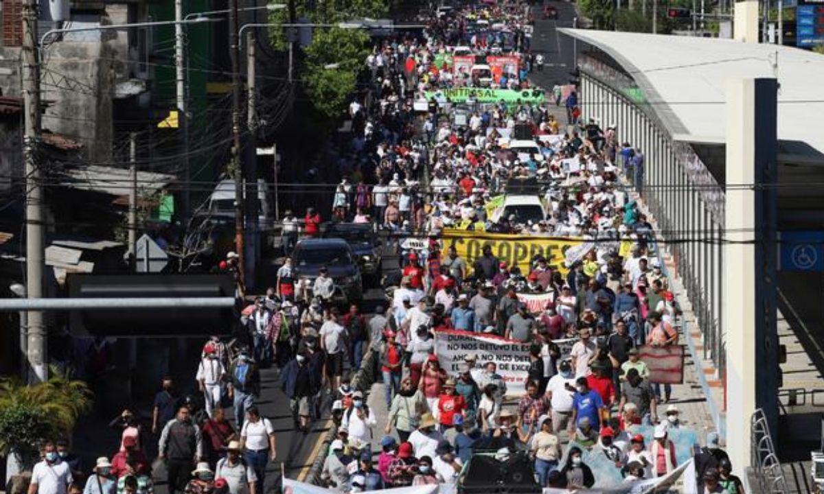 Ondeando pequeñas banderas con la inscripción «Resistencia popular» y «Libertad para los detenidos», la manifestación salió del parque Cuscatlán, en el sector oeste de San Salvador, y llegó hasta la céntrica plaza Gerardo Barrios.