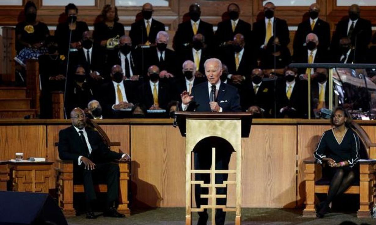 Al presentar a Biden, Warnock señaló que el presidente era «un católico devoto» para quien «este servicio bautista podría resultar un poco bullicioso y animado… pero lo vi aplaudiendo». Warnock se refirió a King como «el mayor profeta estadounidense del siglo XX» y repasó algunos de los logros políticos del presidente, diciendo que eran «obra de Dios» en los que «Biden ha tenido algo que ver».