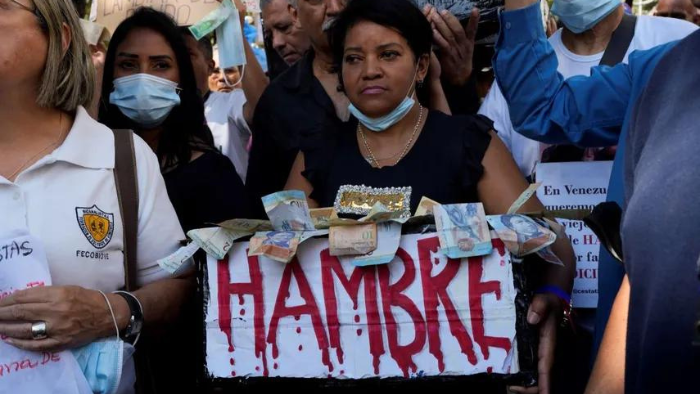 Odalis Aguilar, maestra de 50 años de la ciudad de Maracay, afirmó que “nuestros salarios son una miseria. Gano 460 bolívares mensuales (cerca de 23 dólares). Eso desde marzo (del 2022) que fue el último aumento y eso se ha devaluado”.