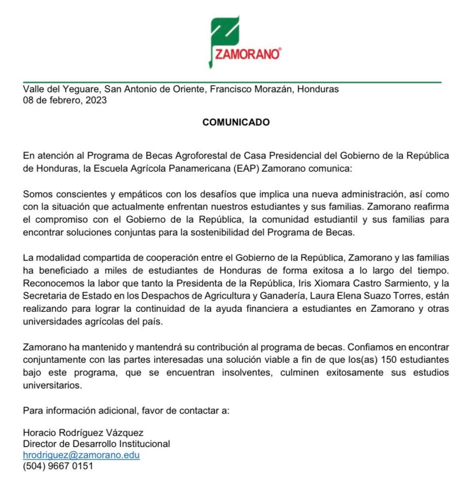 Esta universidad reconoce la labor de la presidenta Xiomara Castro y la titular de la Secretaría de Agricultura y Ganadería (SAG, Laura Suazo, de continuar con la ayuda financiera a estudiantes en Zamorano y a otras universidades agrícolas del país.